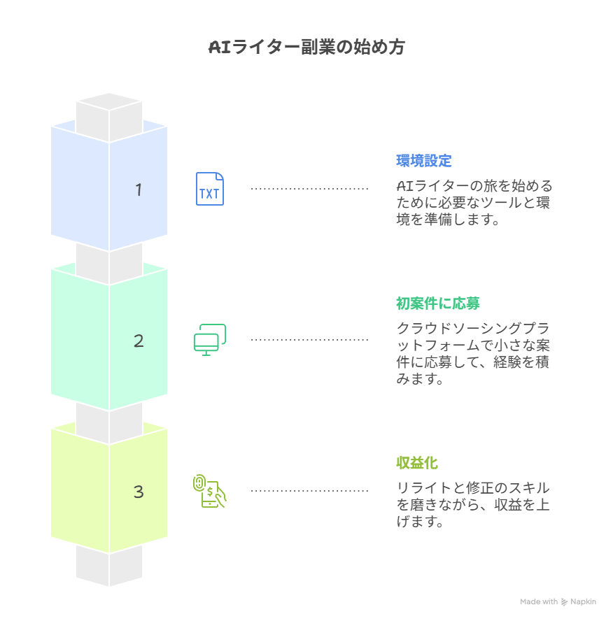 その後、AIの文章を修正するスキルを高めることで、安定収入につながります。ここでは初心者でも迷わず進める3ステップを解説します。